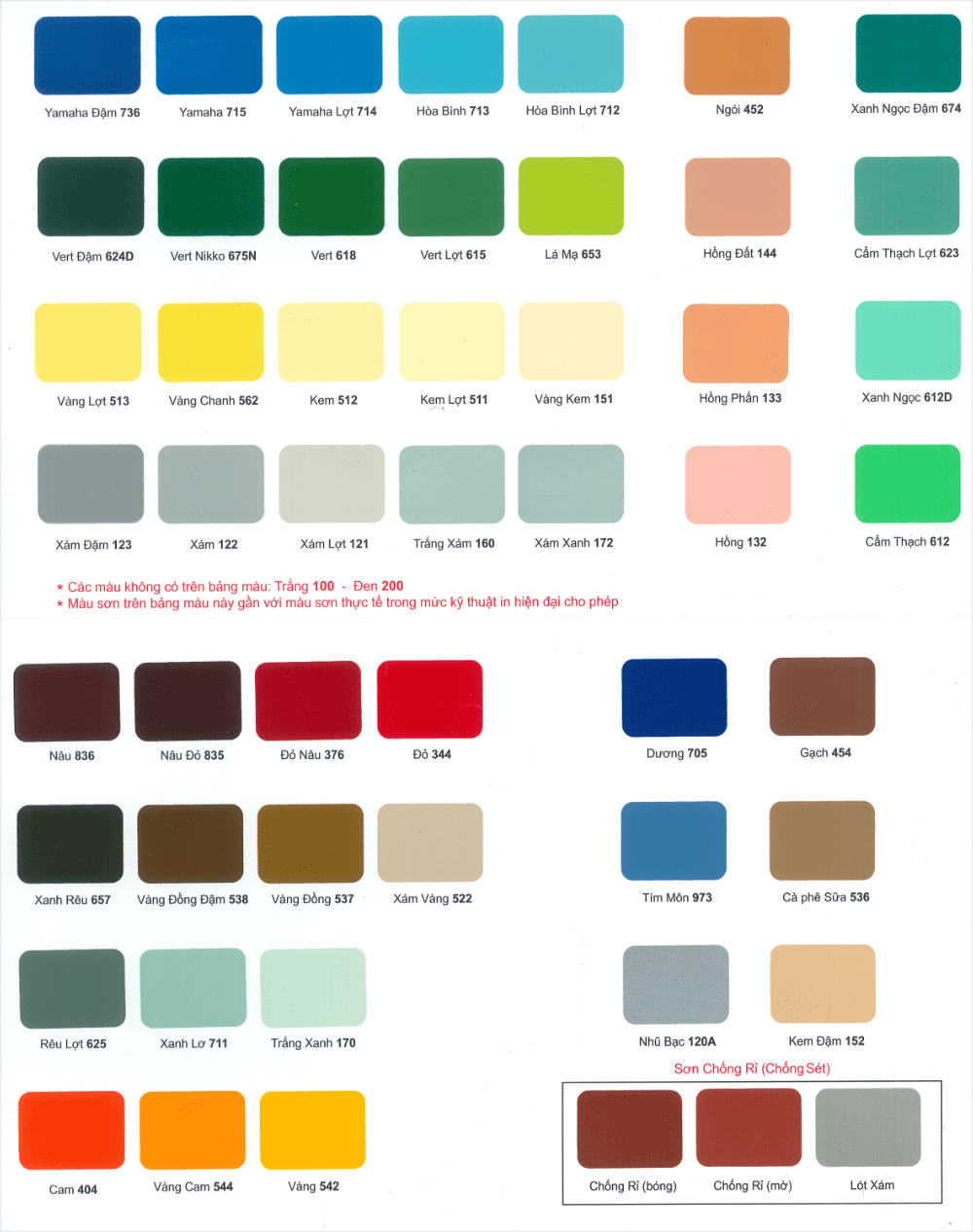Các mã màu sơn Bạch Tuyết bao gồm: Yamaha Đậm 736, Yamaha 715, Yamaha lợt 714, Hòa Bình 713, Hòa Bình Lợt 712, Ngói 452, Xanh Ngọc Đậm 674, Vert Đậm 624D, Vert Nikko 675N, Vert 618, Vert Lợt 615, Lá mạ 653, Hồng Đất 144, Cẩm Thạch Lợt 623, Vàng Lợt 513, Vàng Chanh 562, Kem 512, Kem Lợt 511, Vàng kem 151, Hồng Phấn 133, Xanh Ngọc 612D, Xám Đậm 123, Xám 122, Xám Lợt 121, Trắng Xám 160, Xám Xanh 172, Hồng 132, Cẩm Thạch 612, Nâu 836, Nâu Đỏ 835, Đỏ Nâu 376, Đỏ 344, Dương 705, Gạch 454, Xanh Rêu 657, Vàng Đồng Đậm 538, Vàng Đồng 537, Xám Vàng 522, Tím Môn 973, Cà Phê Sữa 536, Rêu Lợt 625, Xanh Lơ 711, Trắng Xanh 170, Nhũ 120A, Kem Đậm 152, Cam 404, Vàng Cam 544, Vàng 542. Mã màu sơn chống rỉ (chống sét): Chống Rỉ (bóng), Chống Rỉ (mờ) và Lót Xám.