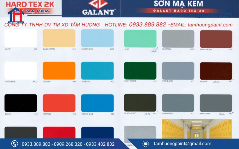 Màu sắc của sơn mạ kẽm Galant Hard Tex 2k: màu trắng/ white 400, màu đen/ black 410, màu Vàng/ yellow 409, màu trắng mờ/ Flat White F 422, màu đen mờ/ Board Black F 488, màu đỏ/ Red 405, màu xanh dương/ Pacific blue 432, màu xanh/ river blue 477, màu xanh lá/ light green 415, màu xám/ Platinum 4205, màu xám/ stone grey 431, màu bạc/ aluminium 450