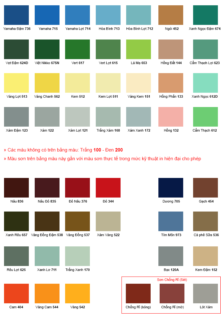 Mã màu sơn chống rỉ (chống sét): Chống Rỉ (bóng), Chống Rỉ (mờ) và Lót Xám.