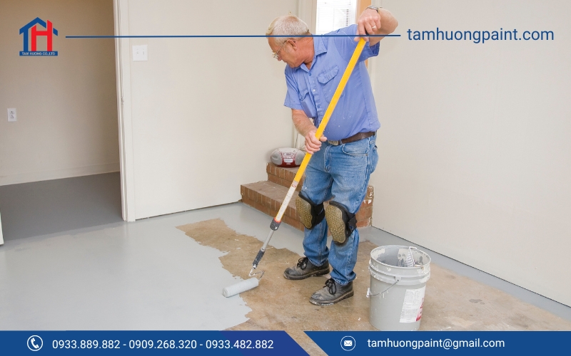 Bước 2: Dùng dụng cụ phù hợp để sơn phủ 2 đến 3 lớp hỗn hợp đã pha lên bề mặt sàn với mỗi lớp cách nhau từ 6 đến 8 tiếng.